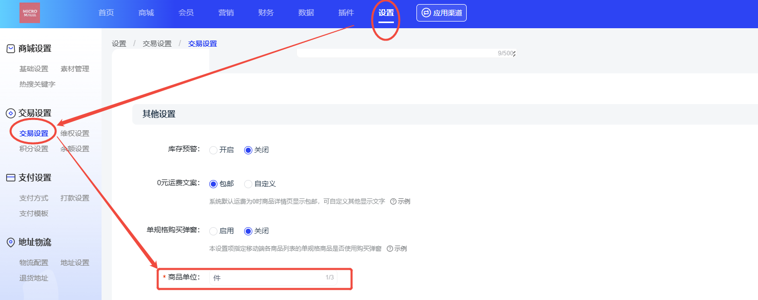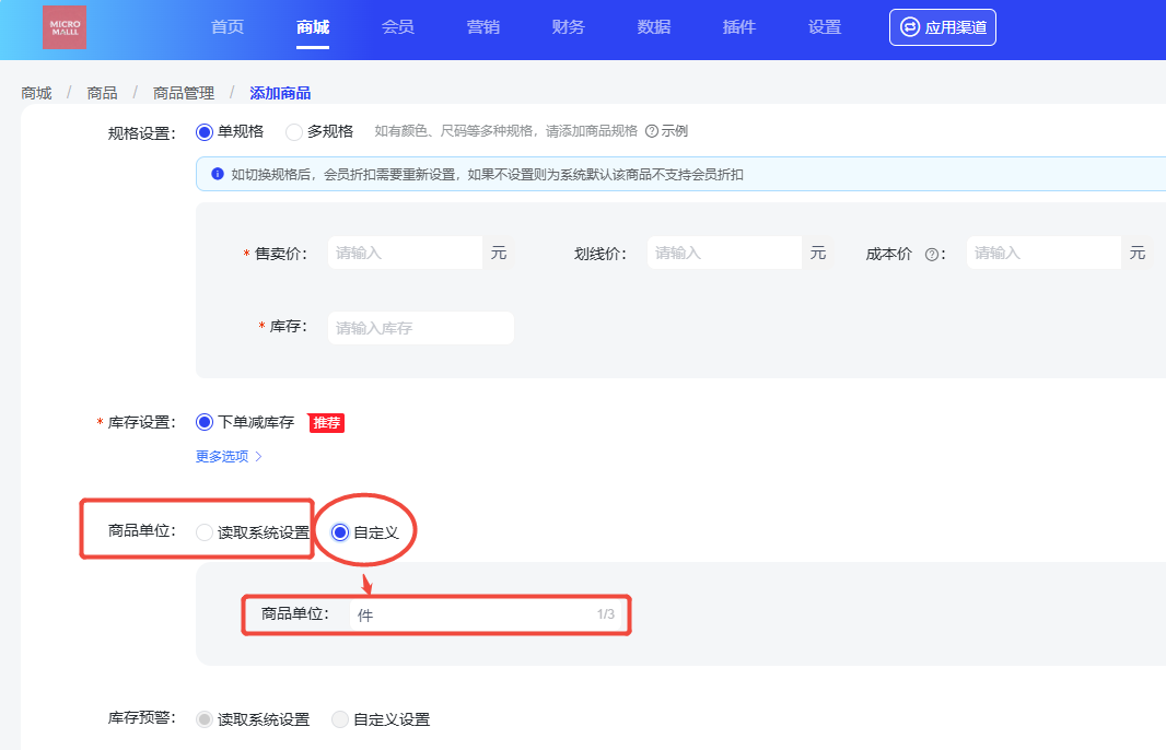 系统默认商品单位为“件”,如果不合适的可以自定义修改: